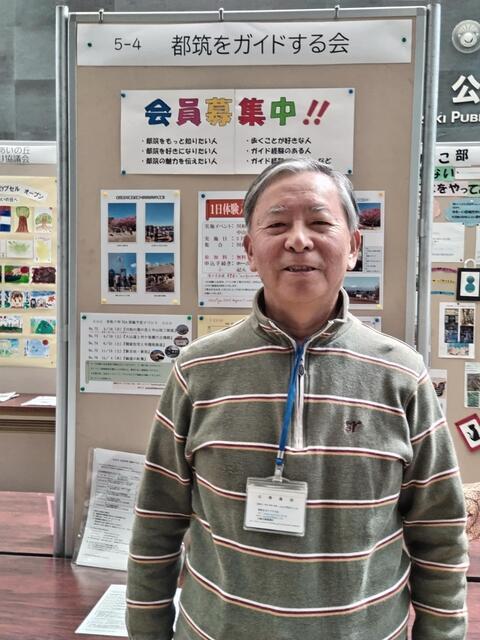 つづき人交流フェスタのパネル前で、笑顔の吉澤義則代表
