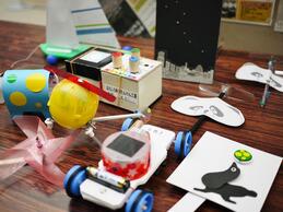 平面ポスターとパンフレットで整ったパネル展の中に、ソーラーカーやICラジオ、風車などが展示されたブースがある。