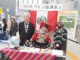 ペルー在住の目にも鮮やかな民族衣装をまとう女性が、NPO法人子どもがかける虹の森ネットワークが主催するスペイン語ミニ講座の講師。