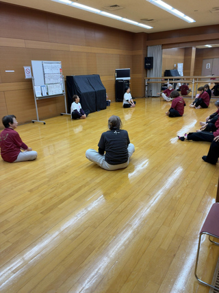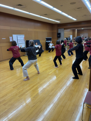稽古は24式太極拳と八段錦を2つの柱とした全国共通のカリキュラムだ。準備体操から始まり、続いて八段錦の前半そして24式太極拳を通しで行う。休憩を挟んで部分稽古に入り、2つの型をじっくり練習する。再度24式太極拳を曲をかけながら行って、最後に八段錦の後半を行う。稽古について森山さんに聞いた。他の太極拳と大きな違いは素足で行うこと。「大地から気を取り入れて気血を良くしてっていう楊名時先生の教えがあるから、私たちは素足」