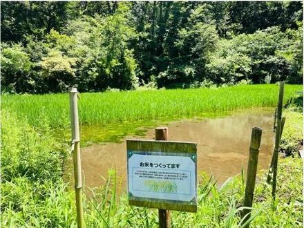 「昔ながらの米作り体験」が行われる田んぼ。苗床づくりから、田起こし、しろかき、田植え、田の草とり、かかし作り、稲刈り、脱穀、推肥入れ等、年間を通じてお米作りが体験できる