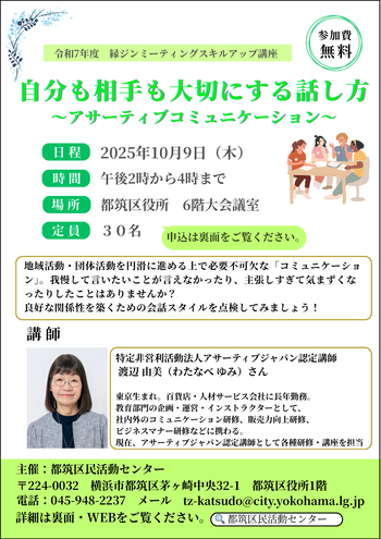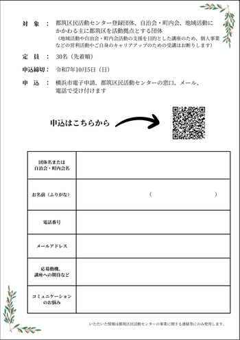 都筑区民活動センターに登録している活動団体をはじめ、主に都筑区を拠点とする公益的な活動団体のスキルアップと交流を図るために開催します。