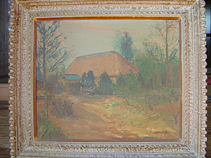 その昔は、八反歩の敷地が目の前に広がってました。ある時、通りがかった絵描きさんがぜひ描きたいといって描いてくださったのがこの絵です。茅葺きの大きな家でした。前に道路を作るっていうんで今のような家にしましたね。