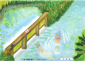(インタビュー1回目の大久保さんの絵(画像:57KB)を見ながら)小学校の3.4年になると大棚堰で泳ぎの練習です。プールなんて元からないので灌漑用の堰の自然プールですね。毎回、川の南側の荏田町と北側の中川町とのちょっとした小競り合いがあるが荏田側が少し強かったので大棚堰、追い払われた中川側はちょっと離れた小さい堰で泳ぐ、そりゃ男の子ばっかりです。
