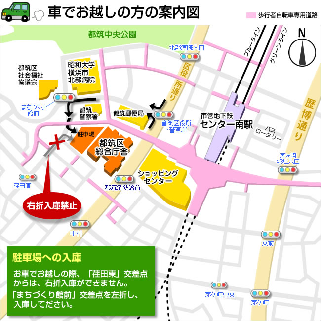 「まちづくり館前」の交差点を左折し、都筑警察署を通りすぎて左側に、都筑区総合庁舎の駐車場入口があります。